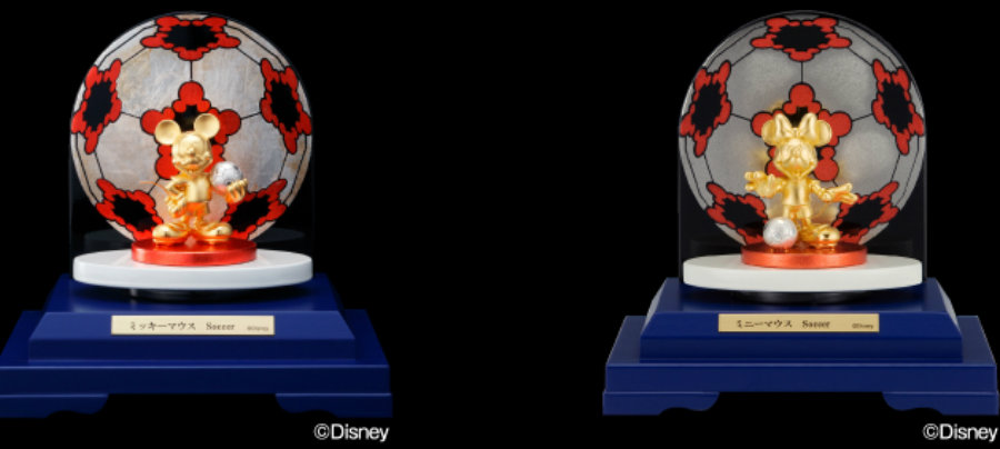 Entre as peças, estátuas graciosas dos personagens Mickey e Minie. Cada uma custa 518.400 ienes, com imposto.