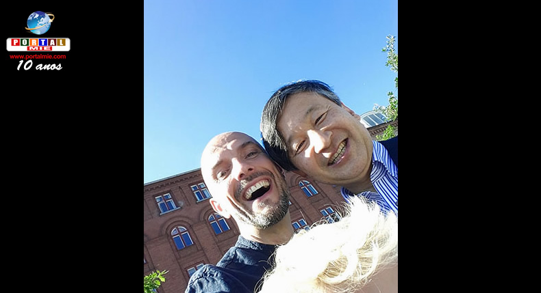 Príncipe Naruhito em selfie com Heine Pedersen em Copenhague, Dinamarca no dia 17 de junho (Asahi)