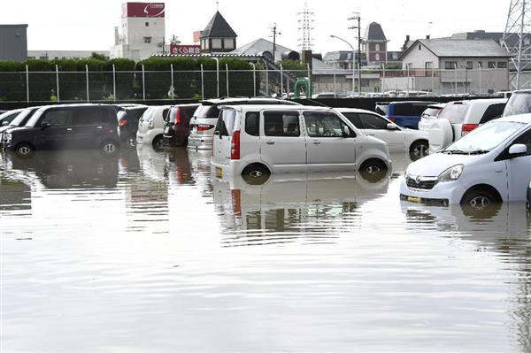 Estacionamento com a água quase cobrindo os pneus dos veículos em Oguchi-cho (Sankei)