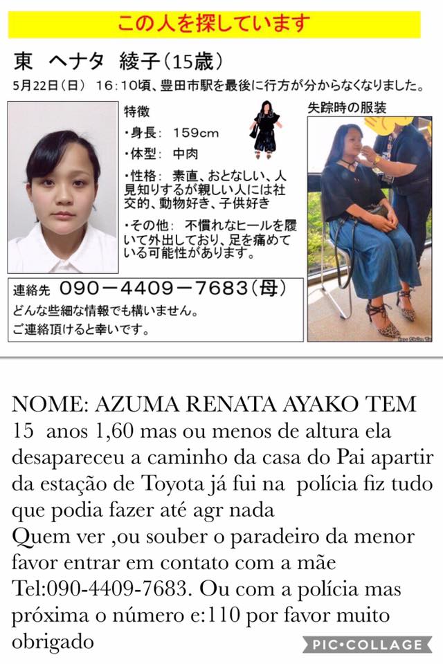 Ela saiu de casa vestida com uma pantalona jeans e uma blusa preta, tem cerca de 1,60 de altura, 15 anos, conforme mostra a foto que foi tirada em outra ocasião. Quem puder ajudar com informações, pode ligar para o número 090-4409-7683 (mãe, Reny) ou avisar a polícia, através do número de telefone 110.