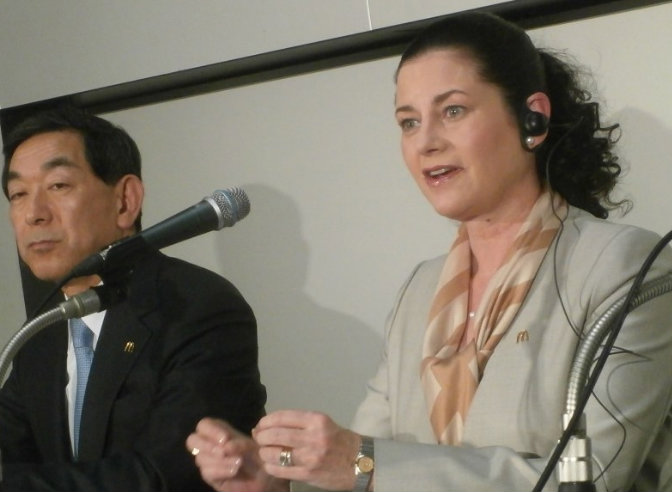 Sarah Casanova, presidente da McDonald’s Holdings, apareceu sorridente diante dos jornalistas na coletiva de imprensa realizada na quinta-feira (9), na capital japonesa.