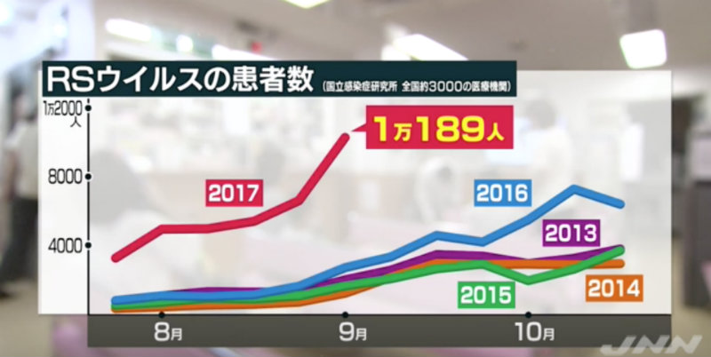 A epidemia do VSR – vírus sincicial respiratório (ou RS ウイルス em japonês) no Japão foi observada em crianças e atinge um número recorde, em relação ao mesmo período nos anos anteriores. O Instituto Nacional de Doenças Infecciosas levantou que até 3 deste mês, foram constatados 11.890 casos, recorde desde 2003.