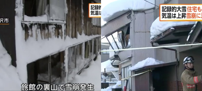 Em Yuzawa (Akita), ocorreu uma avalanche, depois das 19h de terça-feira (13). Ela quebrou vidros das 5 janelas de um hotel em estilo ryokan, enchendo os 3 quartos de neve. Esse hotel com águas termais Doroyu fica na encosta de uma montanha.
