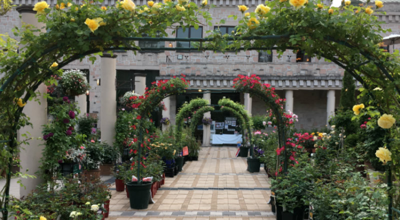 Rosas em arcos e nos vasos fazem o visitante esquecer do tempo