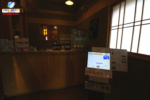 A área de recepção do café é bem simples, com um painel de chamada e alguns produtos com tema do Snoopy e sua turma à venda no balcão do caixa: