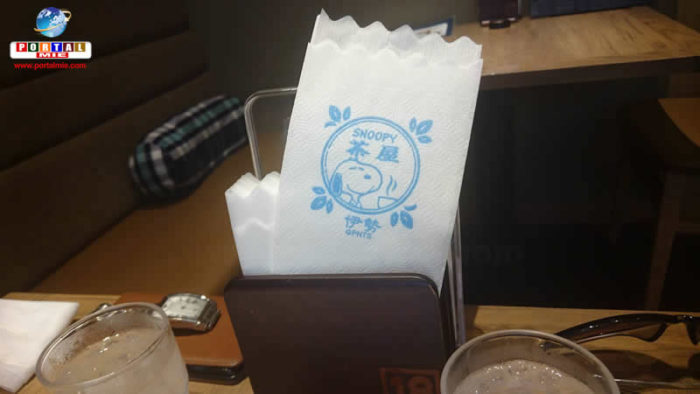 O cardápio e os guardanapos de papel também têm motivo do Snoopy:
