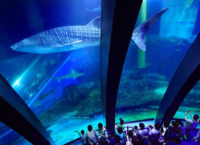 Um tubarão-baleia foi colocado em exibição no Yokohama Hakkejima Sea Paradise no distrito de Kanazawa – o único de seu tipo atualmente exibido na região leste do Japão.