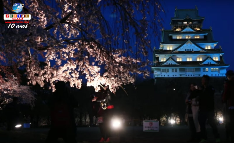 As flores das cerejeiras do Nishinomaru Teien (Jardim Nishinomaru) contracenam com o Castelo de Osaka iluminado. No domingo (2), o público teve a oportunidade de apreciar o castelo todo iluminado com luzes azuis, em comemoração ao Dia Internacional da Conscientização do Autismo.