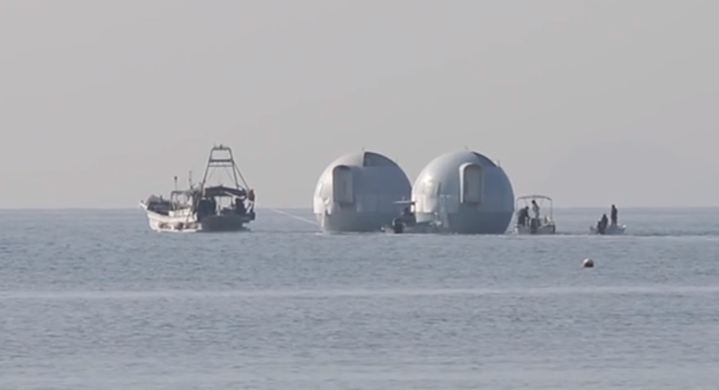 Hotéis em formato de cápsula sendo rebocados por navios (Kobe Shimbun)