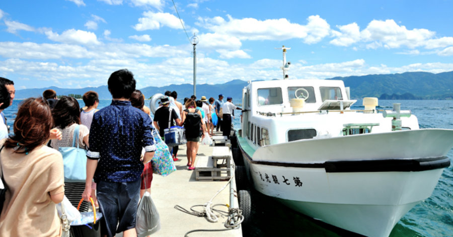 Visitantes tomam o barco para ir a Mizushima (divulgação Tsuruga)