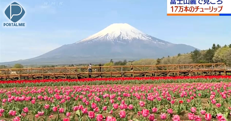 O colorido das tulipas e o imponente Monte Fuji encantam aqueles que visitam o parque (NHK/reprodução)