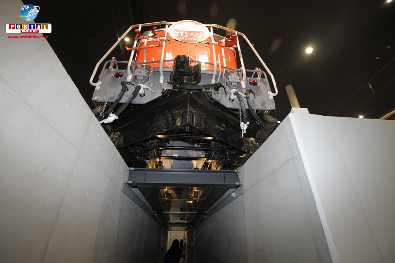 Os visitantes podem andar sob um trem e observar o funcionamento interno de uma locomotiva de carga.