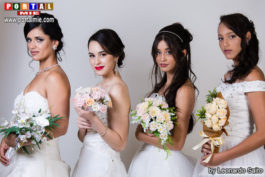 Todas demonstraram confiança e habilidade com os pinceis. Evelyn Saito e suas assistentes Nayra e Dani supervisionaram a prova e orientaram as alunas na produção das noivas.
