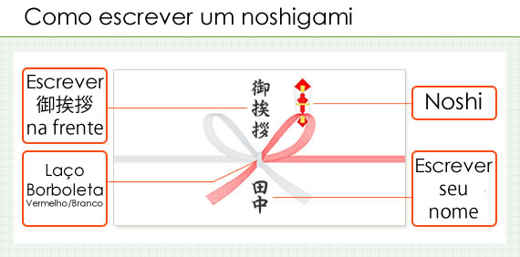 Conforme a figura acima, deve-se escrever “御挨拶” (Go-aisatsu) na parte de cima e o nome de família na parte de baixo. No caso de cumprimentos para os antigos vizinhos, deve-se escrever “御礼” (Orei) ao invés de “御挨拶“.