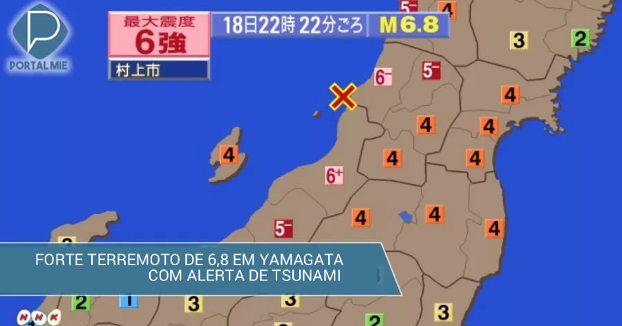 Às 22h22 de terça-feira (18) ocorreu um forte terremoto de magnitude 6,8 na costa da província de Yamagata. Foi a 10Km de profundidade, gerando alerta de tsunami na costa de Hokuriku.