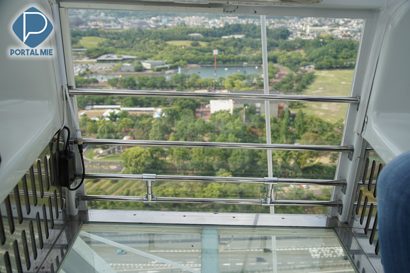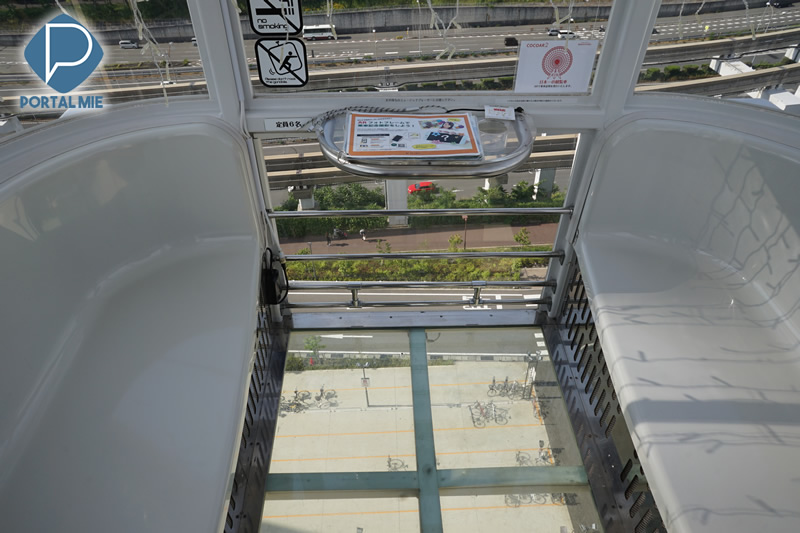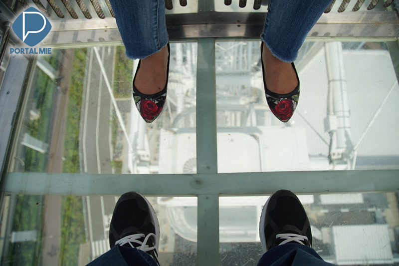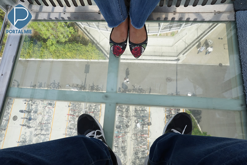 Com o piso transparente a adrenalina na cabine é ainda maior! Olha as bicicletas lá embaixo!