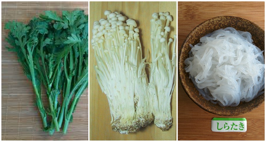 Da esq. p/ direita shungiku, enoki ou enokitake e shirataki (Wikimedia)