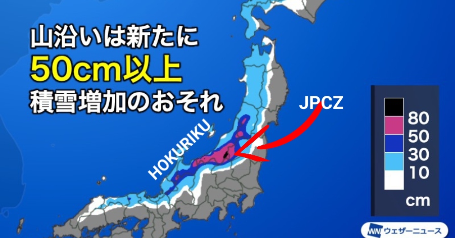 Uma outra causa é a JPCZ (Japan Sea Polar Air Mass Convergence Zone), uma área de baixa pressão, em faixa sobre as províncias de Hokuriku, causa da neve pesada em poucas horas.