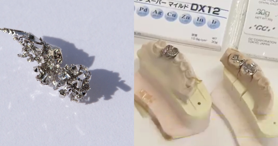 À esq. o paládio (Wikimedia) e à dir. como é usado para coroas e obturações de cáries (FNN)