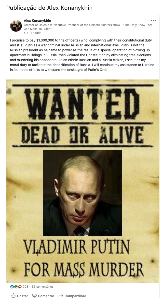 Na quinta-feira (3) um post na rede Linkedin chamou a atenção da imprensa internacional. Um empreendedor e empresário russo que ofereceu uma recompensa, no dia anterior, para quem prender o presidente russo Vladimir Putin, no valor de 1 milhão de dólares, se justificou porque gerou uma certa confusão.