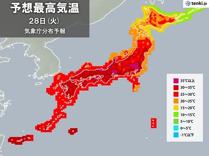 O Japão está coberto da área de alta pressão, além dos fortes raios solares. Por isso, a temperatura diurna deverá subir para cerca de 35ºC. O calor se torna perigoso quando os termômetros marcam mais de 33 graus Celsius.