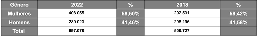 A proporção do eleitorado por gênero permaneceu quase a mesma desde 2014, com predomínio feminino. Em 2022, há 408.055 mulheres habilitadas a votar fora do Brasil, que correspondem a 58,54% do total. Os homens são quase 290 mil, ou 41,46%. Em comparação com o eleitorado do exterior de 2018, o aumento para este pleito foi de 39,2%.