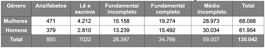 Com relação ao grau de instrução, 130 mil eleitores, cerca de 19% do total do eleitorado, informou ser analfabeto, somente ler e escrever ou não ter concluído os ensinos fundamental ou médio. Os dados apontam também que, dos quase 8.000 eleitores que são analfabetos ou somente leem e escrevem, cerca de 60% são mulheres.
