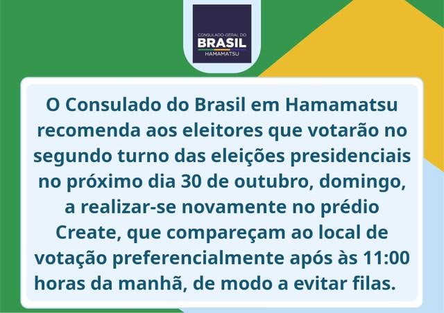 São cerca de 12 mil pessoas da jurisdição do Consulado-Geral do Brasil em Hamamatsu aptas ao voto, cujo local é o Create Hamamatsu.