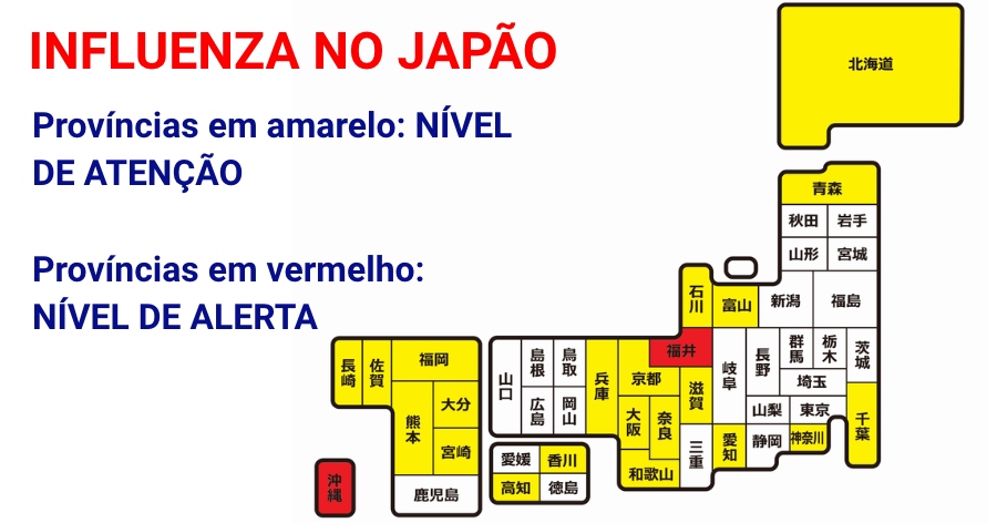 No total são 21 das 47 províncias em nível de atenção e agora são duas em nível de alerta, pois depois de Okinawa, Fukui foi adicionada por causa dos elevados números.