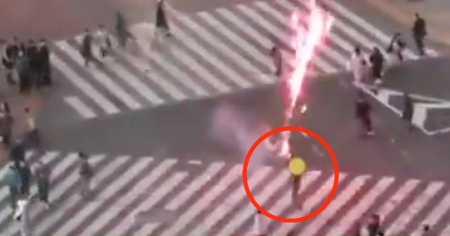 O vídeo mostra um homem caminhando tranquilo enquanto lança os fogos de artifício – hanabi em japonês – durante a travessia da faixa de pedestres do cruzamento de Shibuya, em Tóquio, geralmente muito movimentado.