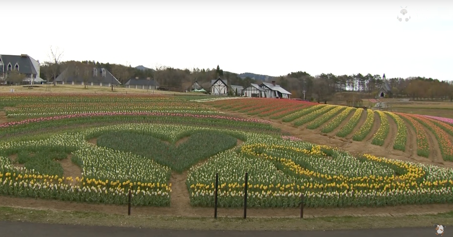 A área onde tem uma plantação de tulipas em desenho de coração, mas ainda não floresceu. Portanto, pode ser uma boa ideia fazer um passeio inesquecível no começo do feriado da Golden Week.