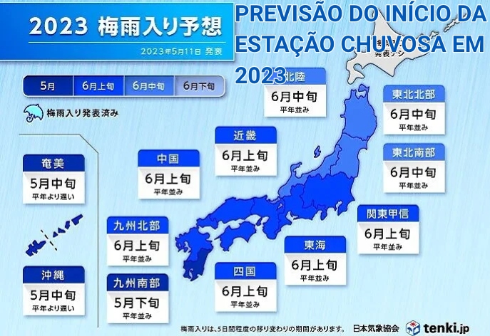 A propósito, os primeiros locais a entrarem na estação chuvosa (tsuyu em japonês) são Amami e Okinawa, possivelmente esta semana; sendo que a previsão para Kinki, Tokai, Hokuriku e Kanto é de meados de junho.