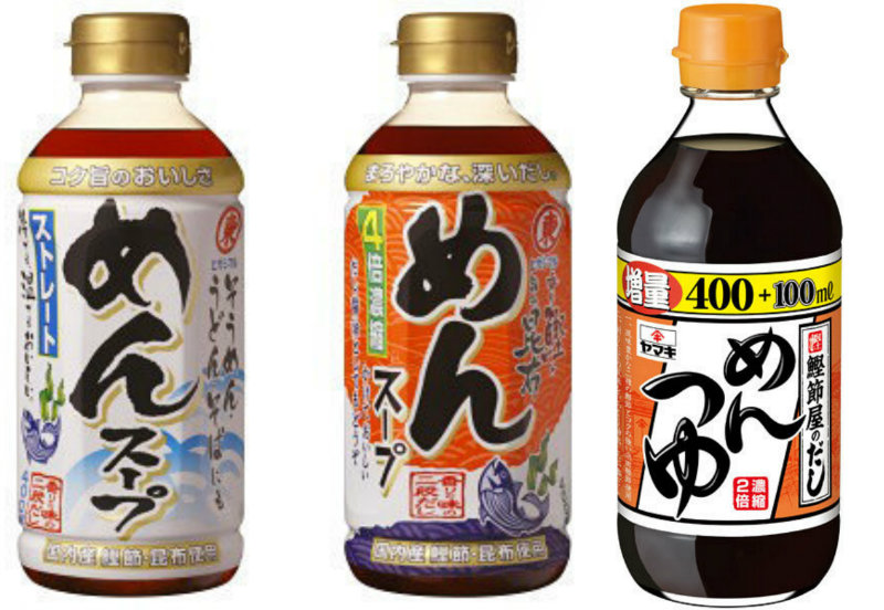 O caldo para os macarrões japoneses, chamado de mentsuyu (めんつゆ) é largamente utilizado na culinária por seus ingredientes. Pode ser comprado em garrafas, tanto no supermercado quanto nas lojas de conveniência. Práticos, basta colocá-los na tigelinha para saborear os típicos macarrões japoneses: somen (bem fininho e servido gelado no verão), hiyamugi, udon, soba e outros.