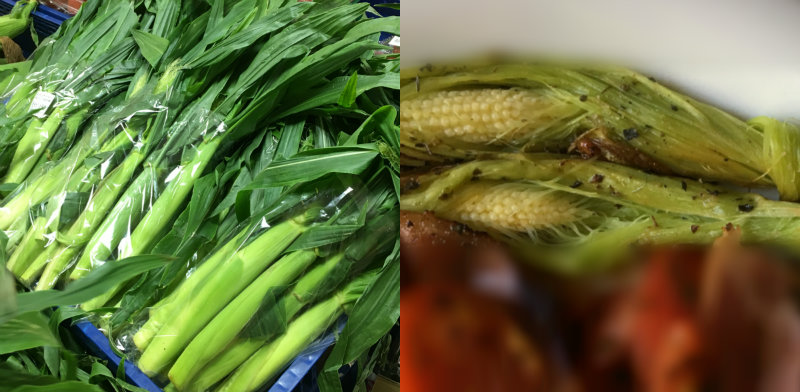 O baby corn é vendido com as folhas. Basta remover algumas e preparar o prato com o cabelo e palha, pois tudo tem sabor de milho verde