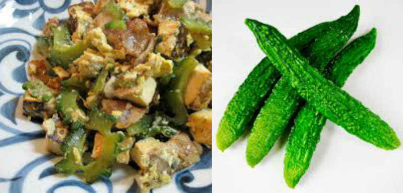 Prato típico de Okinawa, goya champuru, e o nigauri, conhecido como melão-de-são-caetano no Brasil