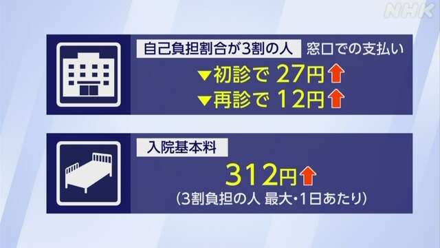 As taxas básicas de hospitalização aumentarão entre ¥50 e ¥1.040, dependendo de vários fatores. Para aqueles com seguro, o pagamento no balcão aumentará em até 312 ienes por dia.