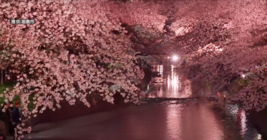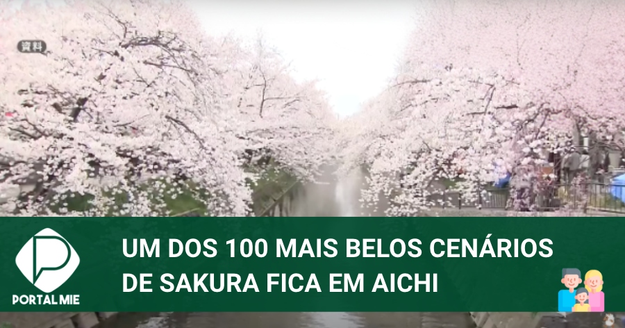 Mais de 1,3 mil cerejeiras floridas em ambos os lados do rio, um dos 100 mais belos cenários do país (Nagoya TV)