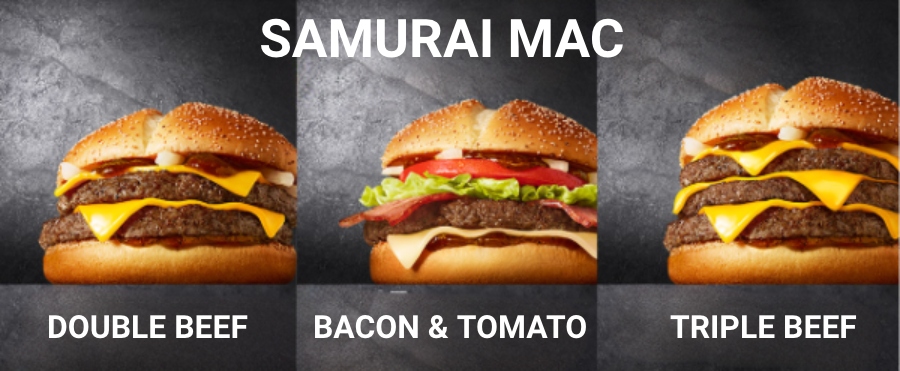 Esses sanduíches voltados para o público adulto que adora carne bovina, têm hambúrgueres bem elaborados. Além do volume, pois são espessos, são feitos 100% de carne bovina, com o tempero que dá um tom japonês, com o aroma do shoyu, por isso o nome Samurai Mac.