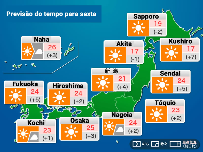 No oeste do Japão, alguns lugares começarão a chover pela manhã, e as nuvens de chuva se espalharão gradualmente para o leste. À noite, a chuva pode cair até a região de Tokai.