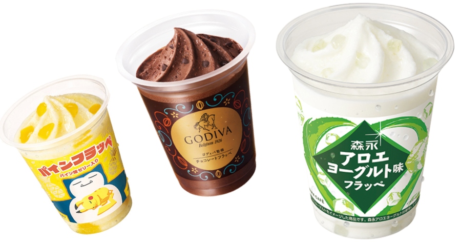 Não deixe de provar outros frapês, como o de chocolate da Godiva (¥460), de Pokémon no sabor abacaxi (¥298), de pêssego (¥298) e outros.