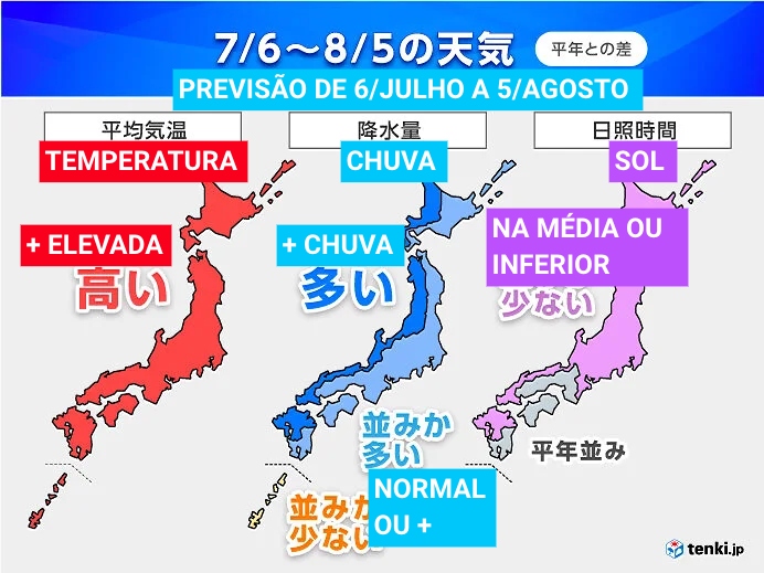 Na quinta-feira (4), a Agência de Meteorologia do Japão (AMJ) divulgou a previsão do tempo para as próximas 4 semanas, de sábado (6) a 5 de agosto.
