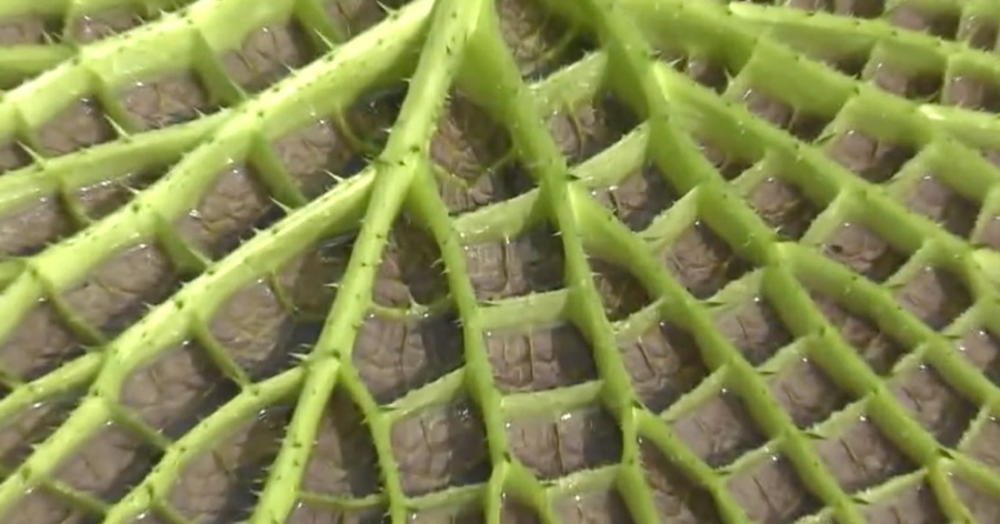 Essa planta tem folhas gigantes, chegando a 1,5 metro de diâmetro, cujo verso tem uma espécie de “veias” em formato de rede, formando bolsas de ar, por isso, flutua no lago.