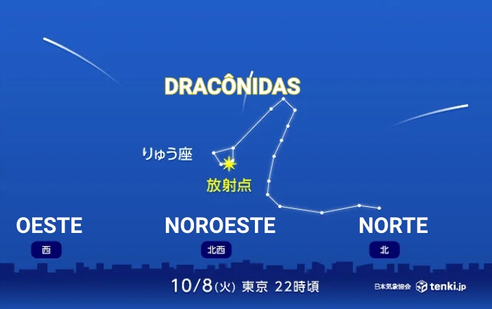 É possível vê-la até quinta-feira (10), mas o pico no Japão ocorre por volta de terça-feira (8). Os Draconídeos são fragmentos provenientes do cometa 21P/Giacobini-Zinner. Anualmente são observados vários a cada hora, mas isso varia de ano para ano.