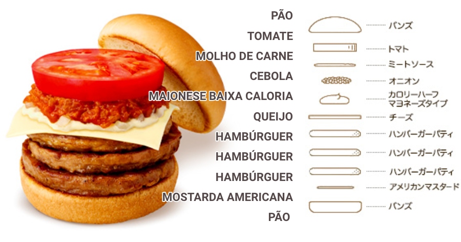 O sanduíche triplo hambúrguer (トリプルモスバーガー) tem 680 kCal e custa 760 ienes.