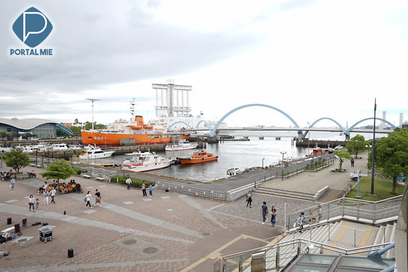 Atracado no porto está o Quebra-gelo Fuji, o navio que o Japão usou para explorar o Oceano Antártico entre os anos 1960 e 1980.