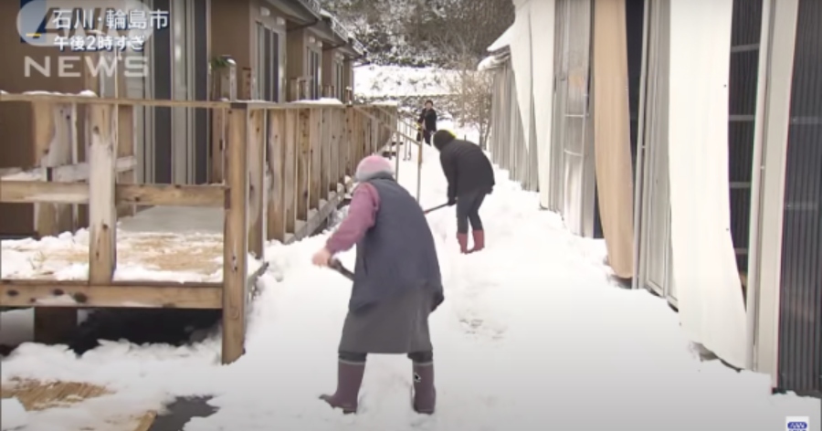 Também caiu neve nas áreas afetadas pelo desastre. O limpa-neve não vencia a retirada na cidade de Wajima (Ishikawa) e nos locais ainda não pavimentados o trabalho teve que ser manual. É onde estão morando temporariamente as vítimas do terremoto, em casas pré-fabricadas.