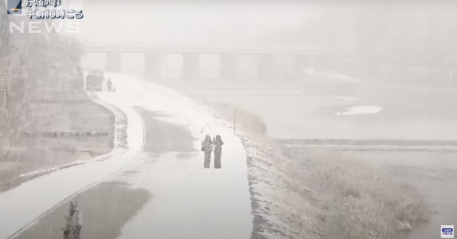 Na cidade turística de Quioto os turistas comemoram a neve que caiu pela primeira vez nesta temporada. “A neve deixa tudo ainda mais atraente. É mágica”, disse um casal da Austrália.