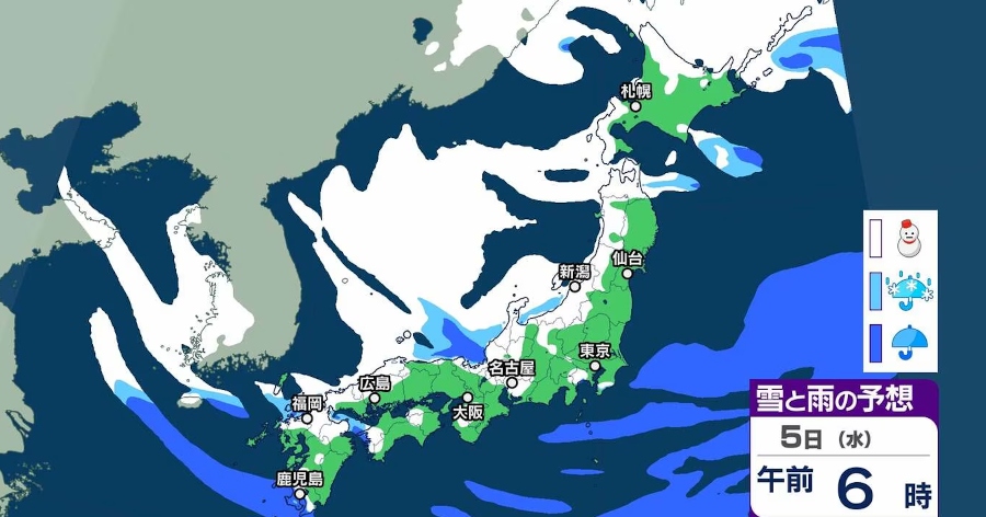 Previsão para 6h de quarta-feira (5), com neve inclusive em Nagoia (JNN)