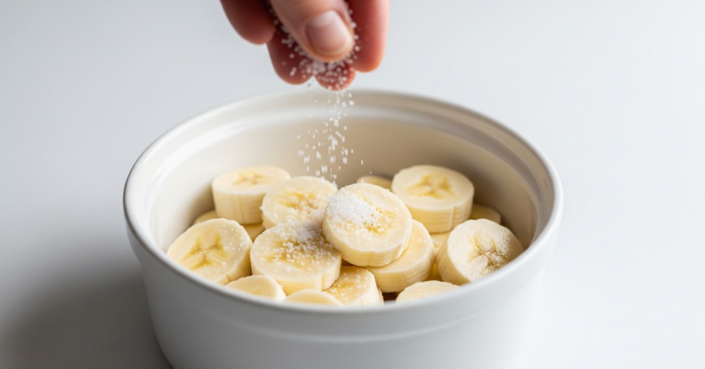 Pessoa polvilhando sal nas rodelas de banana (IA)