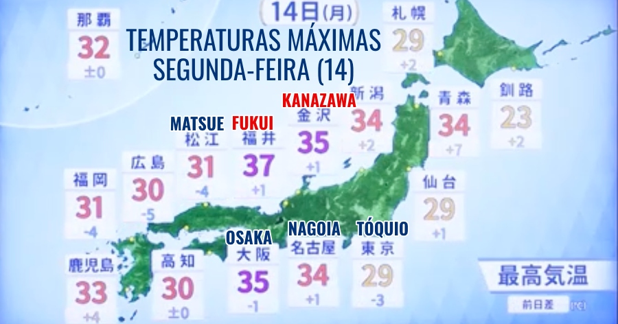 Na segunda-feira a previsão é de máxima de 37ºC na cidade de Fukui e 35ºC nas cidades de Osaka e Kanazawa. A AMJ emitiu alerta de insolação para 5 províncias: Toyama, Ishikawa, Fukui, Oita e Okinawa.